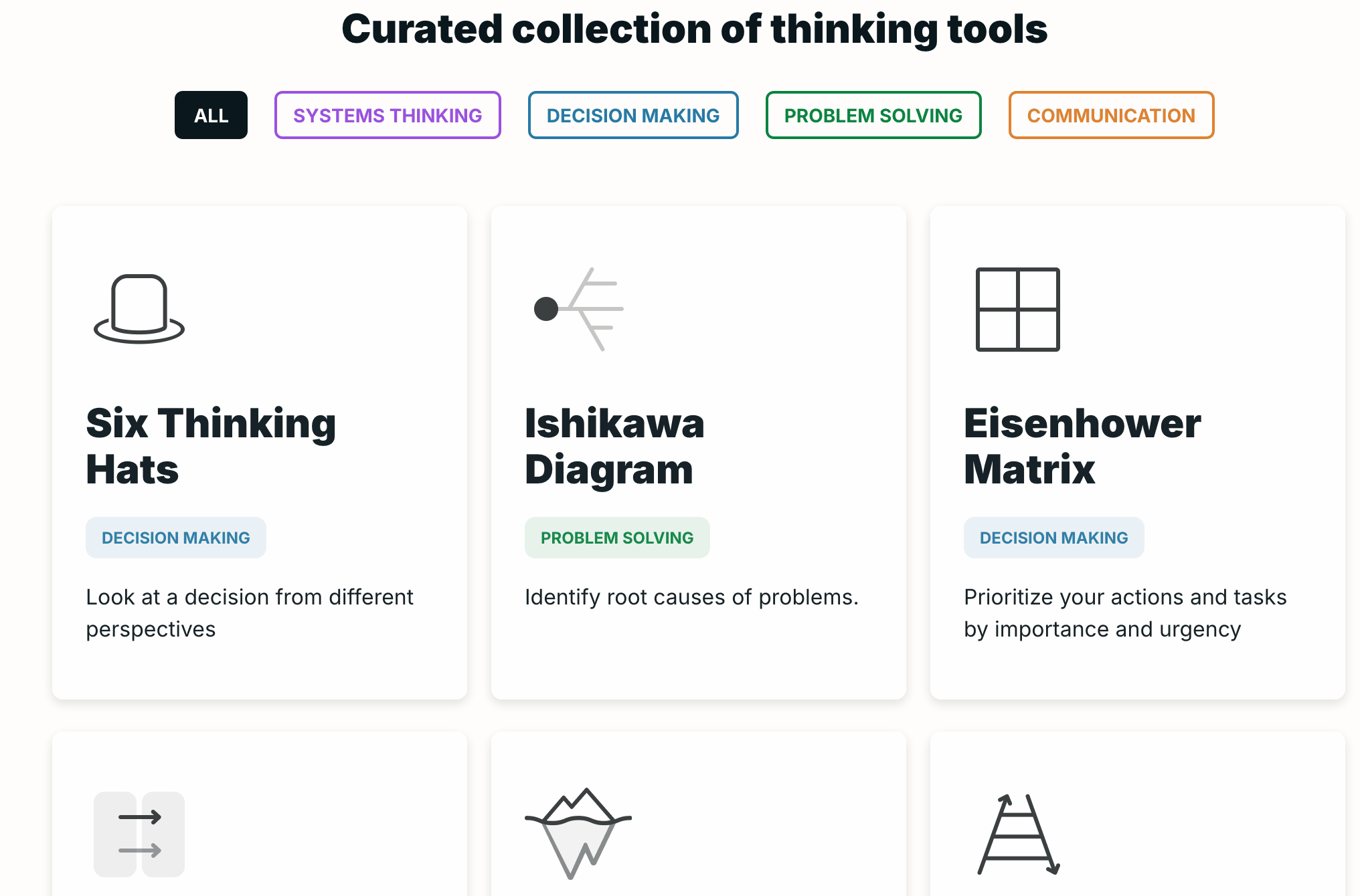 Thinking tools and frameworks to help you solve problems, make decisions and understand systems. Such a well-designed site, this is really worth your time.